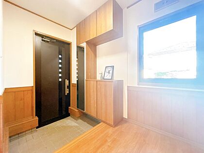 •  【リフォーム済】玄関ホールです。シューズボックスを交換し、天井・壁のクロスを張替え、床はクッションフロア貼りを行いました。玄関はお家の顔となる部分、お客様が最初に目にする場所だからこそ、第一印象が大切