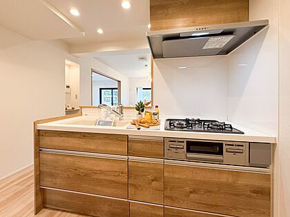 【カウンターキッチン】リビングにいるお子様と会話をしながら家事ができるカウンターキッチン。いま手があいているか、忙しそうなのか相手の様子を伺いながらコミュニケーションをとる訓練にもなります。…