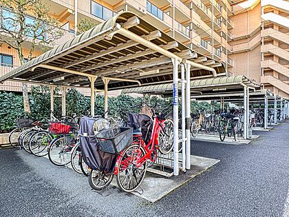 【駐輪場】屋根付きの駐輪場です。屋根の有無で、自転車の寿命は大きく変わります。乗るたびに専用のカバーを取ったりかけたりする手間が要らないので、大変助かります。