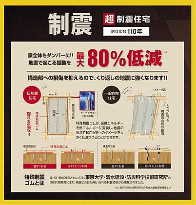 建築基準法の1.5倍の耐震性能である耐震等級3を標準に採用。避難所となる病院や消防署の耐震性能と同レベルです。また、地震の揺れを最大80%軽減する特殊制震ゴムを採用し、繰り返しの地震にも強い家です。