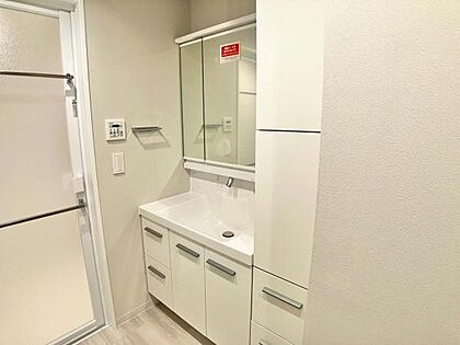 収納が充実した洗面台で、洗面用品やスキンケア用品をすっきり整理整頓。使いやすく、いつも清潔な空間を保てます。毎日の身支度が快適に。