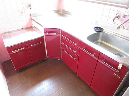 部屋の角にあるL型キッチン。2方向に窓があるので明るいです。