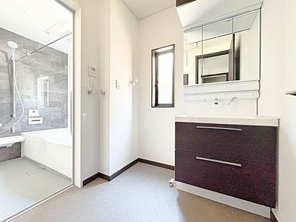 大きく見やすい三面鏡で清潔感ある洗面台は、身だしなみチェックや肌のお手入れに最適です。何かと物が増える場所だからこそ、スッキリと見映えの良い空間に拵えました。