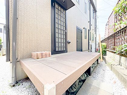 裏庭スペースにはウッドデッキを採用。便利な収納スペース完備で、ゴルフバックやキャンプ用品を収納できます。