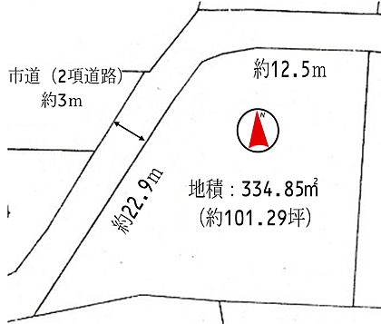 | 土地面積/坪(坪単価) | 334.85m2(登記簿)/101.47坪(21.70万円) | 代表的な接道 | 一方 私道 北西 3m ※詳細は備考欄をご確認ください |