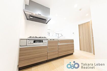 嬉しい3口コンロ。ビルトイン食器洗浄機の為場所を取らず忙しい朝も快適になります。また、収納はスライド式の為、奥にしまい込んだ調理器具等の取り出しもスムーズに行えるため、調理がはかどりますね