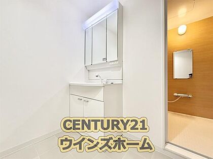 三面鏡付き洗面化粧台。合わせ鏡で後ろのスタイリングも楽ちんです。鏡の後ろは収納になっているので細々したものを収納でき、スッキリとした洗面周り!