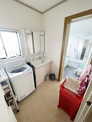 明るい光が差し込む洗面台は洗濯機も設置可能な広々空間です。使いやすい鏡付きの収納付きで便利さが際立ちます。