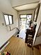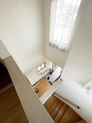 吹き抜けのある開放的な玄関。大きな窓から自然光がたっぷり入り明るく開放的な空間を演出しています。