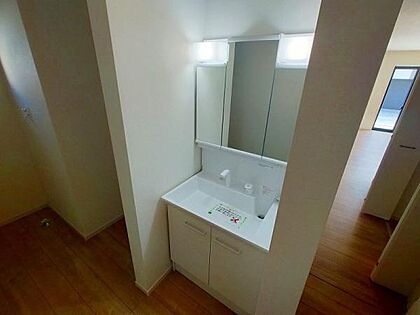 3面鏡の裏に収納があり洗面周りがスッキリ