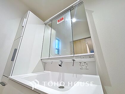 「洗面所」明るく清潔感のある色調で纏められた洗面室は、機能性に富んだ三面鏡と使い勝手の良い収納を完備した洗面台を設置しております。