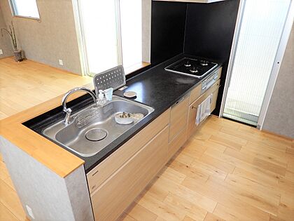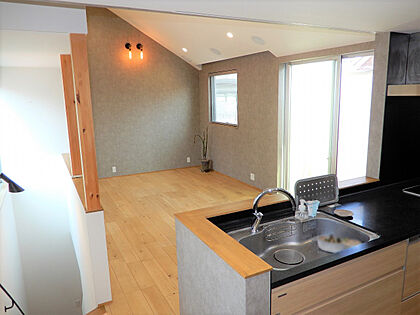 対面キッチン。リビングと一体化した開放的な配置で、会話を楽しみながら家事ができます。