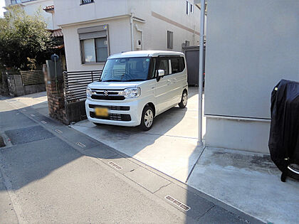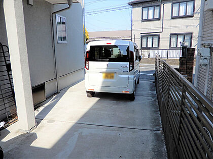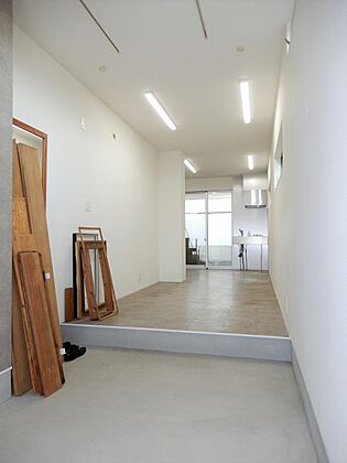 1F 土間収納部約4.5帖。メインの玄関とは別に、土間収納部にも玄関があり、お客様の出入り口としてもお使いいただけます。