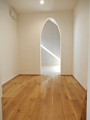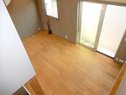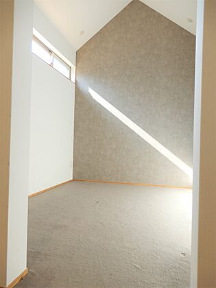 2F 洋室約3.7帖。南西向きの明るい洋室。高い天井にはトップライトがあり、開放感のあるお部屋です。