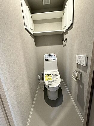 上部に収納棚があり、トイレットペーパーや掃除用具をスッキリ収納できます!