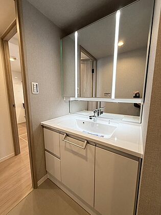 朝の身支度に便利なシャンプードレッサーはとっても便利です!シンク下の収納でアメニティ類のストックもバッチリ!