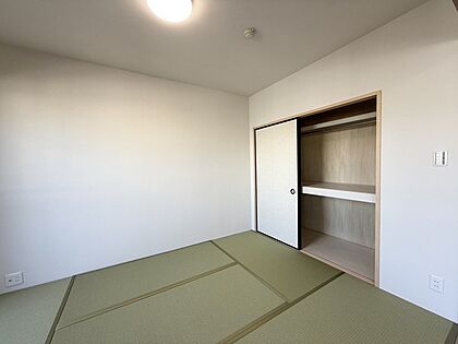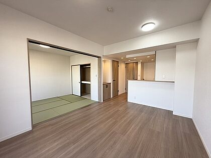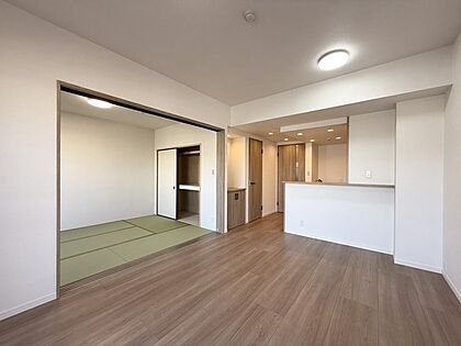 リビング横に設けられた和室スペース。 戸を開放してリビングと一体でお使い頂くと、とっても広く開放的になります! 真新しい畳の良い匂いがしますよっ!