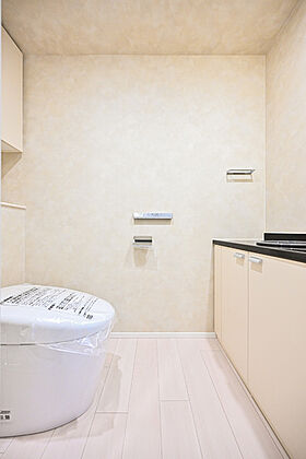 独立した手洗い器が備わった、スタイリッシュなトイレ。吊戸棚にトイレットペーパーなどを収納できます。【トイレ】