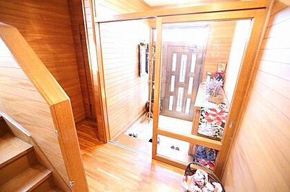 玄関の風除室から玄関周りは余裕のある造りです。木が暖かさを演出しています。
