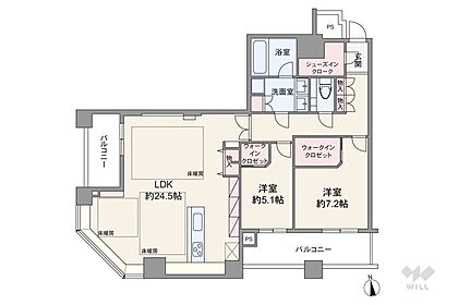 間取りは専有面積98.43平米の2LDK。LDK約24.5帖のプラン。バルコニー面積は14.35平米です。
