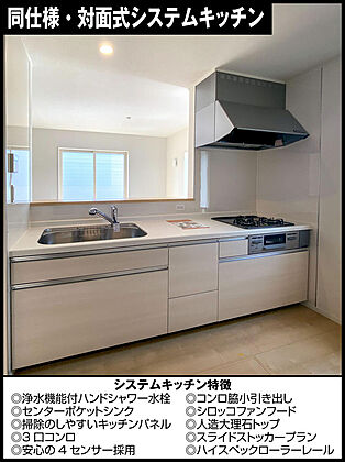 同仕様・対面式システムキッチン吊り戸棚がないので開放感があり、リビングの様子が一目でわかる対面式システムキッチン。収納は物の出し入れがラクラクのスライドタイプ。床下にも収納スペースを完備。