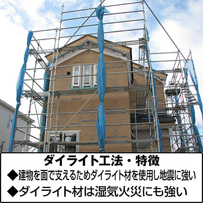 ダイライト工法を採用。従来の木造軸組工法の側面にダイライト材を使い、耐震性・防火性・防湿性を向上させてります。
