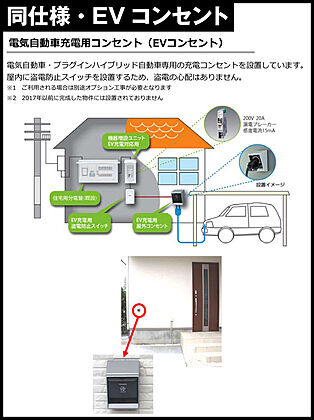 電気自動車充電用コンセント(EVコンセント)を標準装備しております。電気自動車をお持ちの方も追加で工事する必要がなくお使いいただけます。