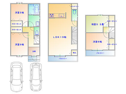 【参考プラン】洋室3部屋・和室1部屋を配置した、3階建の4LDK住宅です。LDKは広さ約19.0帖。全居室に収納スペース有。複数台の駐車も可能です(車種制限有)。