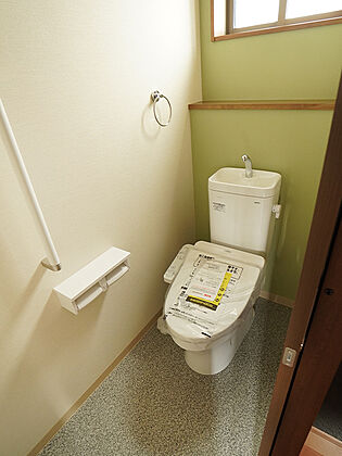 【トイレ】爽やかな色味のクロスは、清潔感と落ち着きを感じさせてくれます。立ち座りをサポートする手すり付きなど、ご要望をお聞かせください。(建物面積100m2、建物価格1770万円)