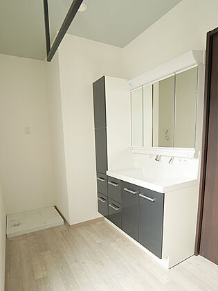 【洗面化粧台】機能性とデザイン性を兼ね備えた、3面鏡付きの洗面化粧台です。ほかにも数種類のカラーをご用意しておりますので、お好みのものをお選びいただけます。(建物面積100m2、建物価格1770万円)