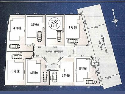 【接道】 角地 ( 北 4.5m ) ( 東 8.7m ) [物件コード]059101-141963、7棟(8号棟) カースペース有  |
