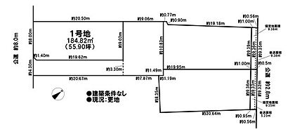 | 土地面積/坪(坪単価) | 184.82m2(登記簿)/56.01坪(41.00万円) | 代表的な接道 | 公道 南西 8m ※詳細は備考欄をご確認ください |