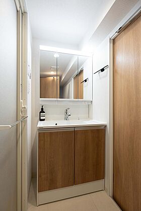 洗濯機置き場。広さに余裕もあり、上部には棚が設置されているので、収納にも便利です。(2025年4月撮影)