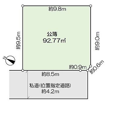 | 土地面積/坪(坪単価) | 92.77m2(登記簿)/28.11坪(63.30万円) | 代表的な接道 | 一方 私道 南西 4.2m ※詳細は備考欄をご確認ください |