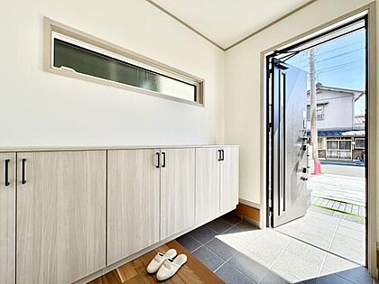 ■■玄関■■人を迎え入れる最初の場所だからこそ、清潔感がある空間にして頂ける様にゆとりあるシューズボックスを設置しました。おでかけの時も帰った時も、「我が家」を最初に感じでもらえる素敵な空間に。