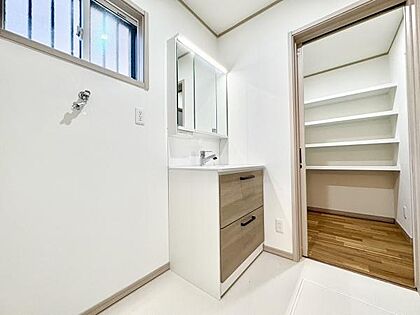 ■■清潔な空間■■毎日使うものだから清潔な空間を保ちたい水回り。洗面にはそんな願いを解消させてくれる収納アイデアが満載です。三面鏡の裏側にはキャビネットが現れ小物から背の高い物まで収納できます。