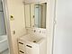 キッチンからの動線が良好な洗面室!収納も豊富な三面鏡の洗面台があります♪