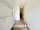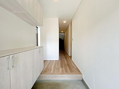 【リフォーム済】玄関には二の字タイプのシューズボックスを設置。フローリング張り、クロスの張替え、照明器具交換を行いました。