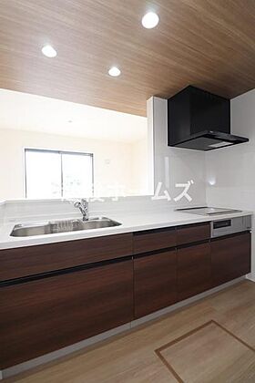 キッチンは使いやすいシステムキッチンです。浄水器一体型の水栓も標準装備しています。