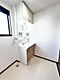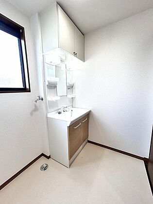 【リフォーム完成】洗面所の写真です。新品交換、クッションフロア張替・クロス張替え・照明交換を行いました。