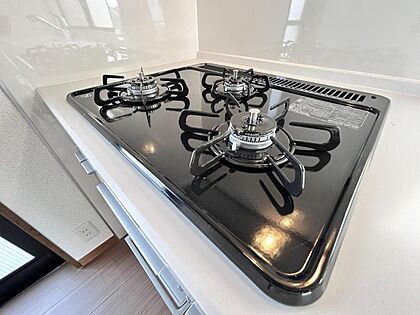 【リフォーム完成】3口あるコンロで同時進行でき時間短縮。ワンタッチ着火で押すだけ、火力調整もレバーで簡単。お手入れ簡単なコンロなのでうっかり吹きこぼしてもお掃除ラクラク。
