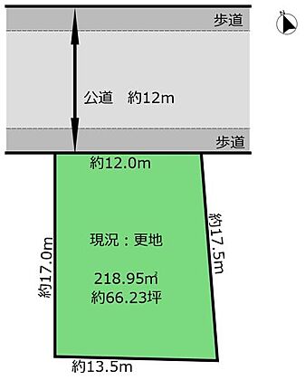 | 土地面積/坪(坪単価) | 218.95m2(登記簿)/66.35坪(28.00万円) | 代表的な接道 | 一方 公道 北 12m ※詳細は備考欄をご確認ください |