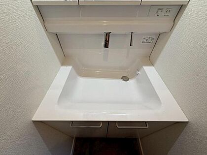 白を基調とした明るくスタイリッシュな洗面化粧台です。照明付きの三面鏡が設置されていて、身だしなみを整えるのに便利です。