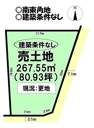 | 土地面積/坪(坪単価) | 267.55m2(実測)/81.08坪(11.10万円) | 代表的な接道 | 角地 公道 南 3.1m、東 7.1m ※詳細は備考欄をご確認ください |
