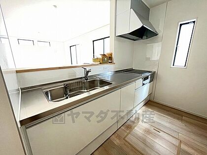 対面式カウンターキッチンでお子様の様子が見守れます。カウンタートップは耐熱性に優れており、日ごろのお掃除もふき取るだけでOK。ステンレスシンクも簡単にお掃除できますよ。