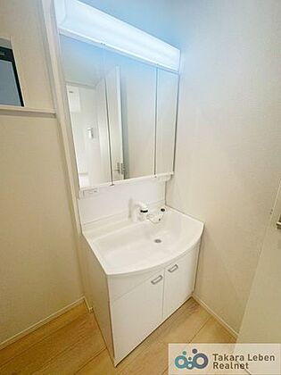 気持ちの良い朝はキレイな洗面所から。鏡裏の収納でモノが出がちな洗面所もスッキリ片付きます。