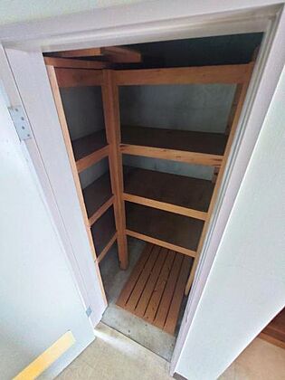 【玄関脇 収納】雨・日除けの道具や防犯グッズなど、使い途様々な玄関脇の収納スペースです。