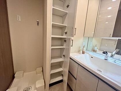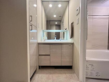≪洗面化粧台≫ 大きな3面鏡の洗面化粧台です。洗面室内にランドリースペースあり