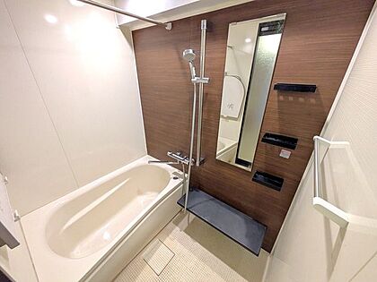 ◆浴室◆モダンなデザインでリラックスの極み!バスタブでゆったりと足を伸ばしてバスソルトも楽しんで☆ウッド調の壁が温かみを演出し、毎日の入浴がまるでスパ気分!疲れた体をしっかり癒せる至福の空間です♪