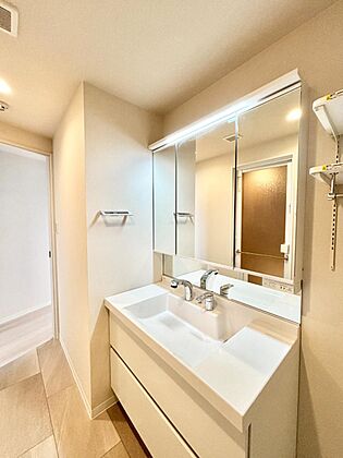 三面鏡の裏に、化粧品や衛生用品などを収納可能。洗面台をすっきりと保ちます!